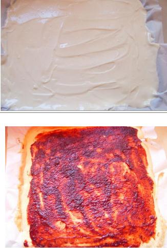 5:把油纸平铺在烤盘内,把蛋糕糊平铺在上面