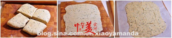 1、将迷迭香叶子撸下来切碎,与泡打粉和细盐一起拌入面粉