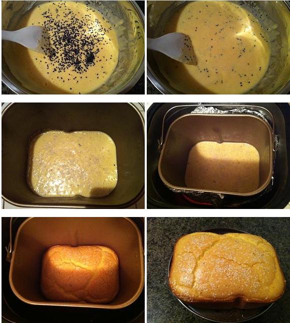4.撒上黑芝麻拌匀,烤箱提前预热,把蛋糕糊倒入面包桶内(外面包上锡纸)震动几下震出气泡再撒一层白芝麻,烤制40分钟。(在烤制结束前的15分钟左右把锡纸拿掉让蛋糕上面着色)
