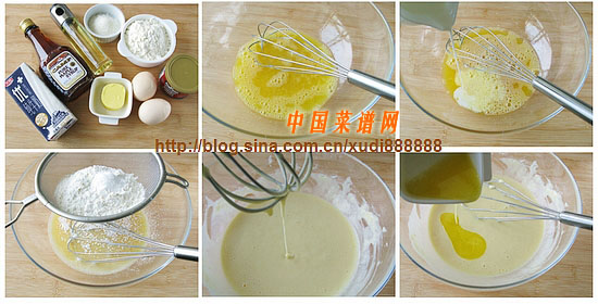 2 倒入牛奶打匀,筛如面粉和泡打粉;