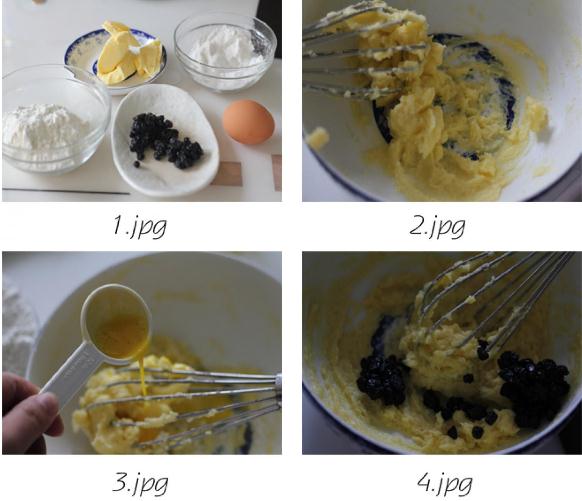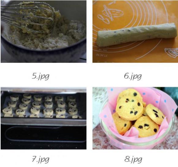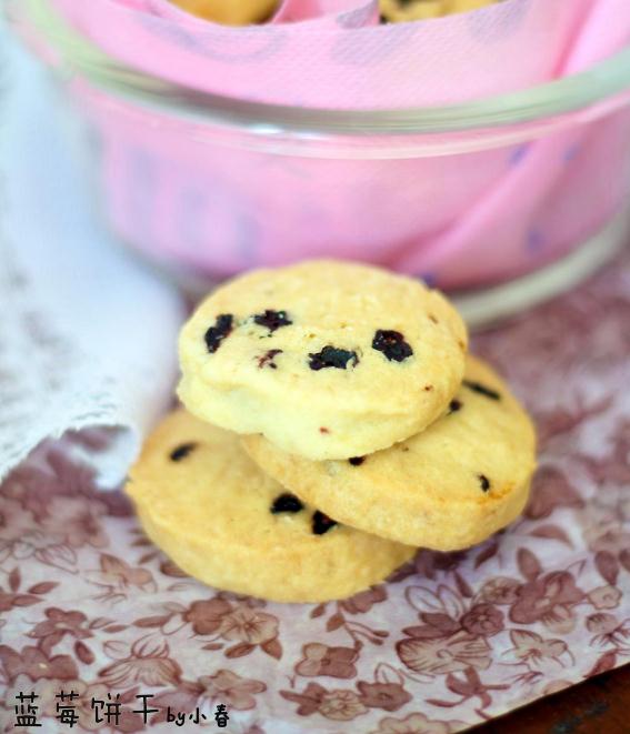蓝莓饼干材料:低筋面粉115克,全蛋液1大勺,黄油75克,糖粉60克,蓝莓果干35克烘焙:160度,中层,约20分钟做法:1:材料图。2:软化的黄油加糖粉搅拌均匀。3:放入全蛋液搅拌均匀。4:放入蓝莓干混合均匀。5:放入过筛的低筋面粉。6:低筋面粉和黄油混合均匀后,整成圆柱型,用保鲜膜包好,放入冰箱冷冻。7:冷冻后的饼干面,切厚片,大概0.5厘米左右,放入预热160度的烤箱,20分钟左右,烤至表面颜色发黄即可。8:放凉之后的饼干会很酥脆,密封保存。