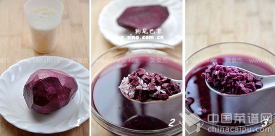 主料:紫薯150克 大米80克调料:水适量做法:煮米糊豆浆机十来分钟搞定,煮粥还是耗时长些——这样我能多睡会儿。多睡十分钟也好啊,嘿嘿。1.准备材料:紫薯(用了图中的一半),大米2/3杯2.紫薯去皮切碎,和洗净的大米一起浸泡一夜3.将浸泡过的紫薯、大米、水加入豆浆机中,制成米糊