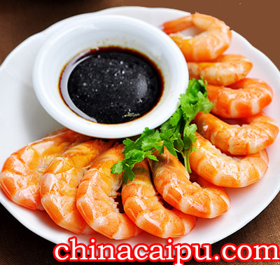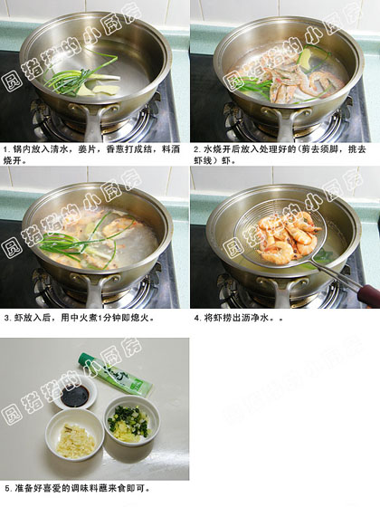 材料:鲜虾200克 姜片2片 香葱2根 料酒1茶匙调味1:生抽和日本芥辣调味2: 蒜蓉, 盐,烧热的熟油淋上去即可, 生抽,糖调味3: 香葱末,姜末,盐,烧热的熟油淋上去即可,生抽, 糖调味料4: 青椒圈加油在锅里略炒,加盐,加生抽,加糖做法:1.锅内放入清水,姜片,香葱打成结,料酒烧开。2.水烧开后放入处理好的(剪去须脚,挑去虾线)虾。3.虾放入后,用中火煮1分钟即熄火。4.将虾捞出沥净水。5.准备好喜爱的调味料蘸来食即可。