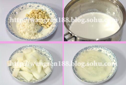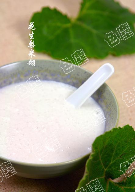 做法:1、粳米浸泡2个小时;花生去皮煮熟备用2、将花生、粳米、适量清水放入食品加工机中打磨成稀糊状3、丰水梨洗净去皮切成块4、将梨打成泥,梨汁另存备用5、梨泥倒入花生米糊中,小火煮开6、边煮边添加清水,同时不停搅拌,直到米糊熟透且稀稠适当关火7、晾到米糊温热后,倒入梨汁拌匀即可。备注:梨汁要等米糊降温后才可倒入,否则营养会受损