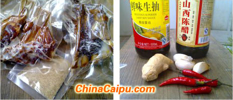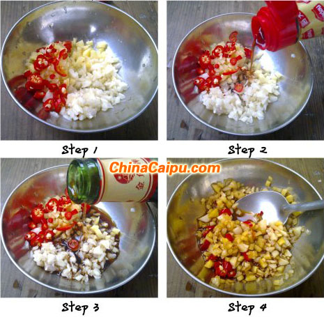 1.姜、蒜、辣椒切碎,放入一只干净的碗中;