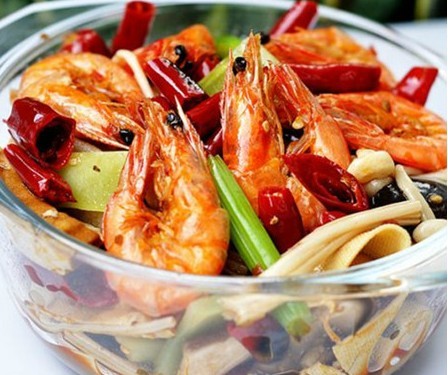 食材:300g海虾、100g五花肉、100g莴苣、100g、100g金针菇、100g豆皮、100g芹菜、适量油、适量盐、100g红干辣椒、适量花椒、适量香叶、适量桂皮、适量八角、适量茴香、10g白糖、5ml香油、适量香菇