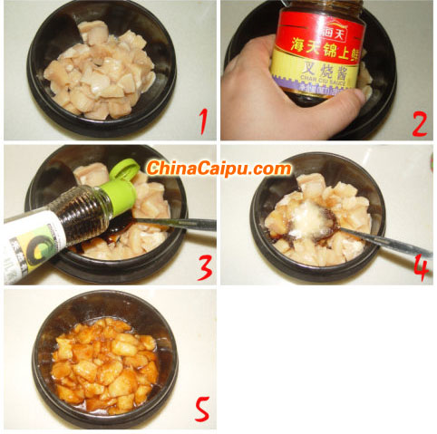 鸡肉腌渍:鸡胸肉、叉烧酱、生抽、白糖、盐、食用油