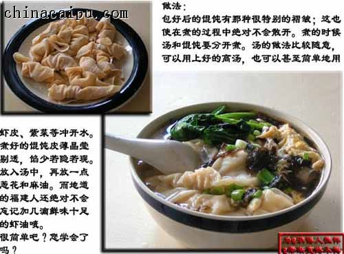 1.方型的馄饨皮,中间放一团馅,将皮在放馅的那个地方一抓,像个水母状的 .2.小馄饨的包法 将四方的皮子中间放馅后,对折成一个等腰三角型, 有馅的那边的两个角沾水一黏在一起后.3.大馄饨的包法 将四方的皮子中间放馅后 上下一折成一个长方型后,左右两手各抓有馅的那边皮子的两个角,将皮子稍稍折下后两个角一黏 .
