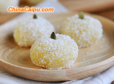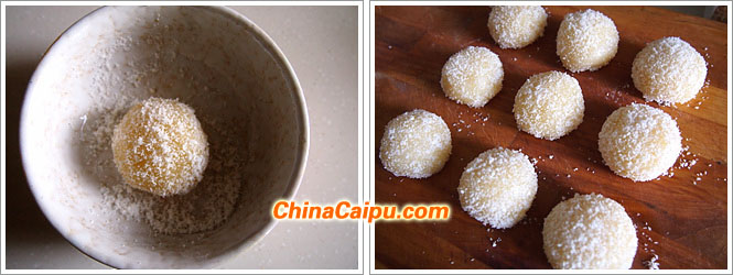 13、出锅后,趁热立刻裹上椰蓉,凉了不容易裹上了。