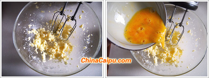 2、全蛋打匀后,分次加入到黄油混合物中,每一次搅打均匀后再加入下一次。