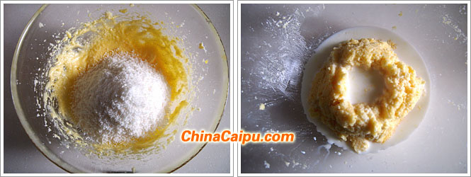 3、加入椰蓉拌匀,搅拌全部湿润即可。