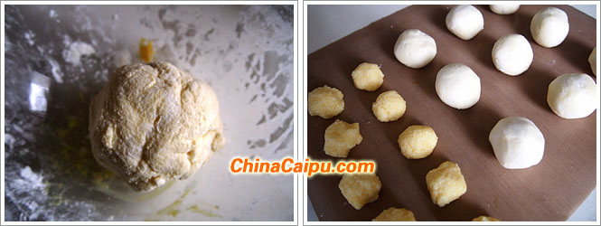 8、把揉好的面团分成小份,每份25g左右。椰蓉馅团成小球,每个约6克左右。
