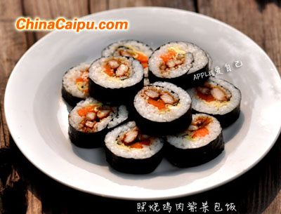 1、 取一张紫菜,铺在竹帘上,均匀铺上米饭,在一侧放上鸡肉条、胡萝卜条、蛋皮条