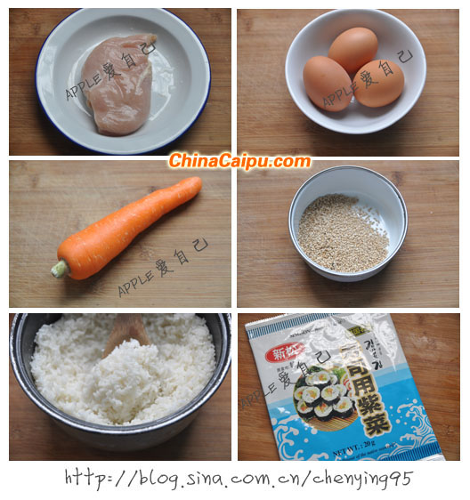 鸡胸肉、胡萝卜、鸡蛋、白芝麻、白米饭、包饭紫菜、白糖、老抽、料酒、芝麻