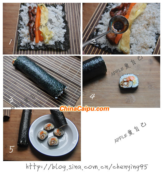 1、紫菜上铺米饭的时候四周尽量空出一圈来,这样卷起接口处不会米饭鼓出来