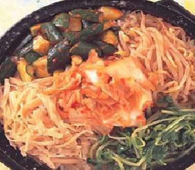 4.将作法1放入作法2的石锅碗内后,再依序加入辣味牛蒡丝、辣酱小黄瓜、黄豆芽拌菜与萝卜樱拌菜,最后再将韩式泡菜放于中间即可。