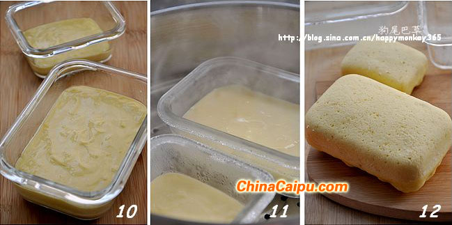 11.12.将模具放入沸腾的蒸锅内,中火,蒸20分钟左右。蛋糕蒸好后,将模具取出倒扣,即可轻松取出。切小块,趁热食用。