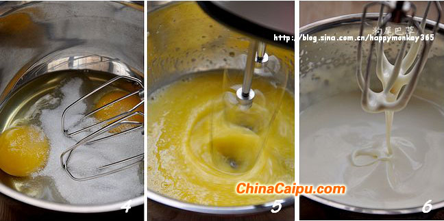 4.5.鸡蛋磕入盆中,加入细砂糖,用电动打蛋器搅打。打蛋器先慢速,再快速。