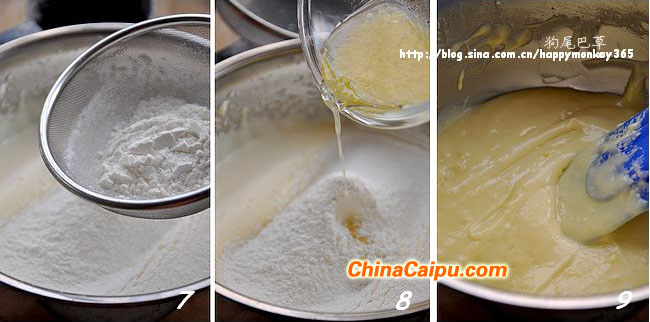 8.9.倒入步骤3小碗中的混合液体。用橡皮刮刀刮拌均匀。