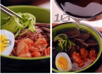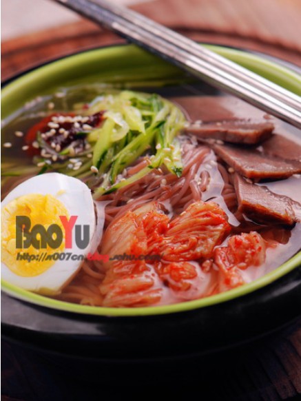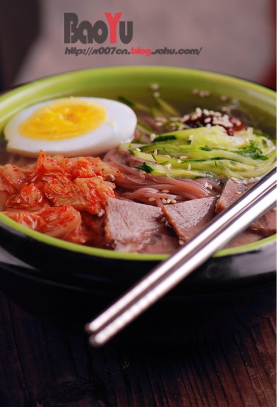 制作原料:荞麦冷面300克,酱牛肉,韩国泡菜,白煮鸡蛋,黄瓜