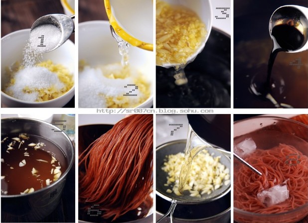 (图1)首先制作冷面汤,姜蒜切细末后加入白糖拌匀
