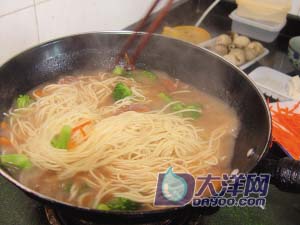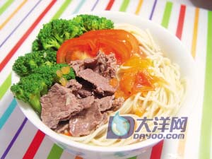 牛肉(50克)、番茄(1只)、拉面(330克)、红萝卜(1/2只)、姜(3片)、浓汤宝(32克)、西兰花(6小朵)
