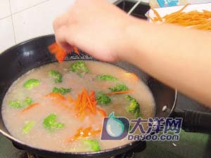 4 烧开锅内3碗清水,放入浓汤宝和姜丝搅散煮沸,倒入红萝卜丝、番茄片、西兰花和牛肉片煮3分钟至沸腾。