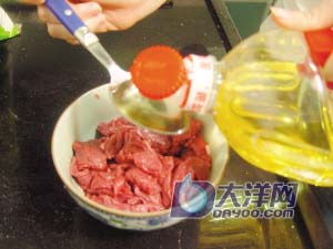 1 牛肉洗净切成薄片,加入1/2汤匙油、1/3汤匙酱油、1/2汤匙生粉和1/3汤匙鸡粉拌匀,腌制15分钟入味。