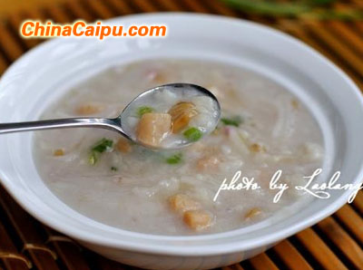 材料:萝卜、熟花生米、精盐、生姜、小葱、面粉、干贝(或海米等),油