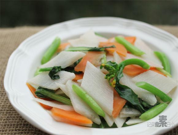 3.重新起锅下少许油,下烫好的蔬菜加1/2小匙盐大火快速炒匀出锅即可。