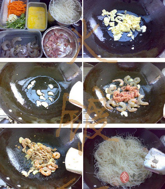 1鲜虾去壳,干米粉泡软,猪瘦肉切条状后用盐、糖、生粉腌好,红萝卜切丝、蛋打散,香菜、葱切段,蒜头切片