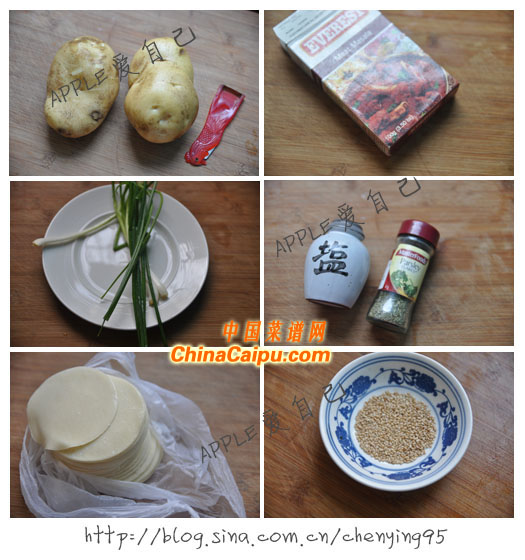 土豆、咖喱粉、盐、欧芹、葱、饺子皮、白芝麻