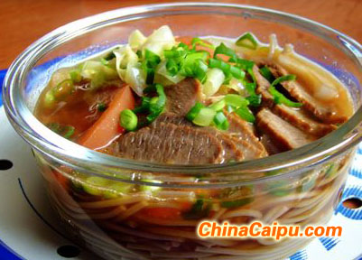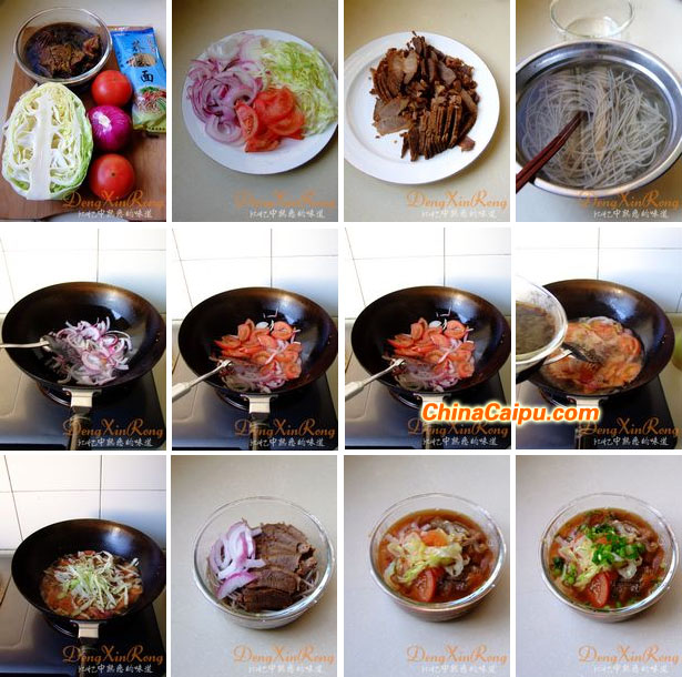 原料:自制酱牛肉(请点击这里)和汤、荞麦面、包心菜、洋葱、西红柿做法:1、荞麦面提前用70度热水浸泡(面条随意);2、包心菜和洋葱切丝,西红柿切片,酱牛肉切片备用;3、起油锅,油热后下洋葱炒香炒至变色透明状;4、下入西红柿翻炒均匀,添加部分酱牛肉汤,再添加适量水,大火烧开;5、下入包心菜丝,调入适量盐和味精;6、荞麦面条浸泡至没有硬芯后,捞出沥干水分;7、面条上码上酱牛肉片和洋葱丝;8、把煮滚的汤浇在上面,撒上葱花即可。