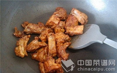 2、排骨炒好后加入开水煮,不要加凉水;