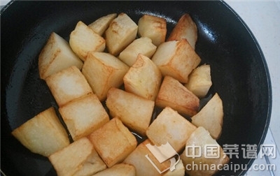 8.另外用平底锅放入适量油烧热,放入土豆慢慢煎至金黄。
