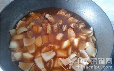 9.将土豆和洋葱放入排骨的锅里煮熟。