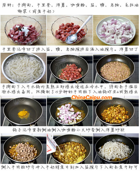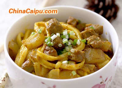 小贴士:1 面条下入开水锅内,煮熟捞出立即过冷水,使得面条口感q弹2 牛肉粒事先腌制下油锅稍炸一下3 咖喱粉先用油炒一下然后再下入配料洋葱超软4 加入处理过的牛肉粒倒入牛奶或者椰浆,这样可以使得香味更浓郁而且可以弱化咖喱略涩的味道5 加入调料后倒入面条焖一下就好了