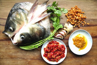 原料:雄鱼头1个,剁椒酱3勺,咸萝卜干丁3勺,贵州灯笼辣椒酱2勺(可不用),姜10克,蒜头3瓣,料酒5勺,香辣粉半勺,胡椒粉半勺,海鲜酱油2勺,蒸鱼豉油1勺,盐适量,香菜1根,菜油2大勺。