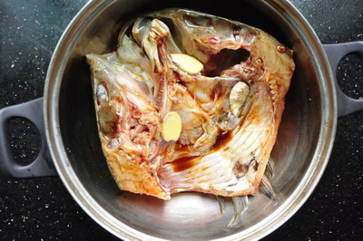 1、雄鱼头请鱼贩子清理好并在鱼头顶端剖一刀(不要剖到底),使鱼头可以拉开平摆在盘中。回家洗净鱼头放在盆中,往鱼头上倒入3勺料酒和海鲜酱油2勺,撒入适量盐和3片姜,不停地给鱼头按摩使其更好地吸收调味料。之后,将鱼头合拢静腌半小时。
