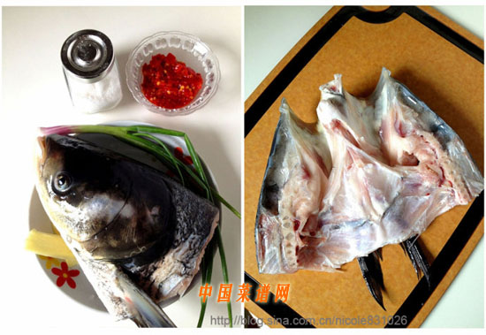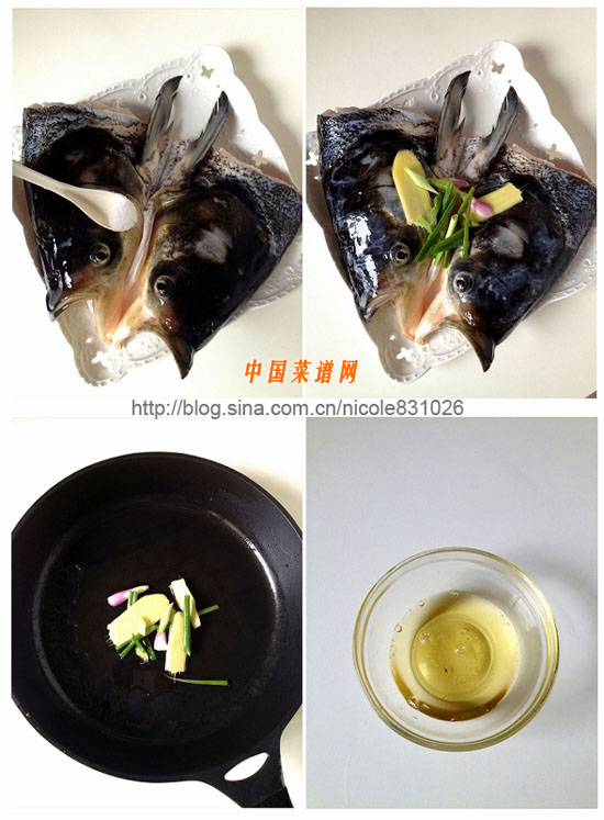 1. 鱼头上撒少许盐和料酒,均匀涂抹在鱼头的内外表面;