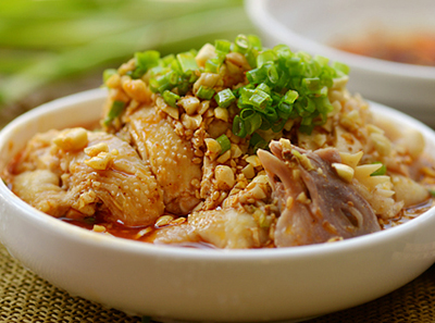 6、浇淋到鸡块上,撒上花生碎和香葱末即可