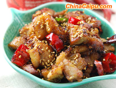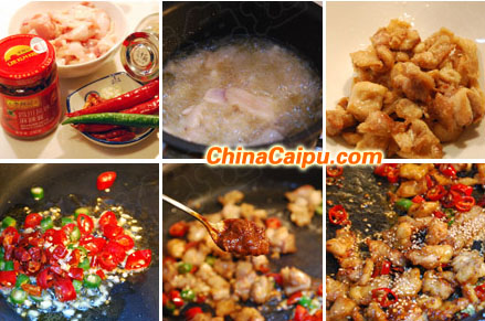5.放入穿过油的鸡丁翻炒,加入白糖,淋上生抽,烹入料酒炒匀。放入四川辣酱快炒。