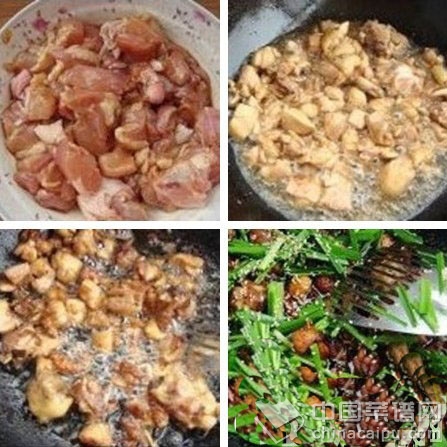 2、起油锅,油稍微放多一点,把鸡块放入锅中煸炒,炒至干香,盛出备用。