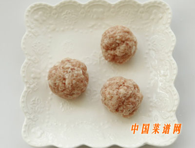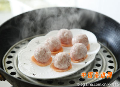 6:胡萝卜洗净去皮切成薄片,肉馅搓成乒乓球大小的肉丸子。