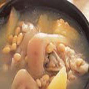 青木瓜猪脚汤的制作材料:主料:猪脚骨高汤4杯 青木瓜1个黄豆100克A料:盐1小匙青木瓜猪脚汤的特色:运用新鲜青木瓜来炖猪脚,会让猪脚又嫩又好吃,木瓜所含的木瓜酵素可以帮助蛋白质分解,帮助消化,更是青春期女性的自然丰胸补品。教您青木瓜猪脚汤怎么做1 青木瓜去皮及籽,洗净、切块;黄豆泡水约3小时,洗净、沥干。2 锅中倒入猪脚骨高汤煮滚,放入黄豆煮至八分熟,加入青木瓜煮至熟烂,加入A料调味即可。