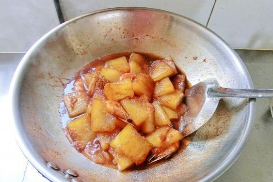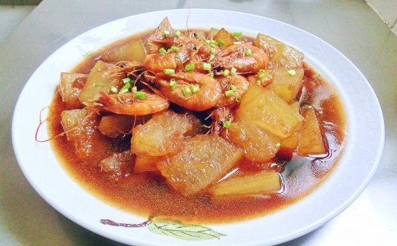 2、待基围虾鲜香味扑鼻时,加入冬瓜略翻炒后淋入适量清水,然后盖上锅盖大火烧开后用小火将鲜虾味炖入冬瓜肉质中。