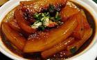 红烧冬瓜原料:冬瓜500克,葱油40克,花生油35克,甜酱25克,酱油25克,白糖10克,精盐3克,味精2克,葱、姜未各少许,水淀粉20克,高汤100毫升。