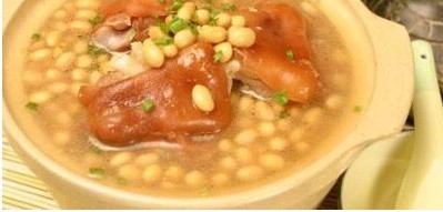 炖黄豆猪脚汤的主料:猪蹄500克,大豆150克炖黄豆猪脚汤的调料:盐3克,白酱油3克,胡椒粉2克炖黄豆猪脚汤的做法:1.将黄豆入盆内,先将坏粒与砂石捡出,然后加入冷水豆粒洗净,即以清水浸泡备用,猪脚洗净放入中型铝锅内,加入二大碗水,一大匙米酒,一大匙白糖,一大匙白醋,即将锅置火上2.初用大火烧滚,撇去泡沫,续用小火烧约半小时,加入黄豆及一大碗水慢炖,见黄豆已烂,即加入白酱油一大匙,盐半茶匙,胡椒粉少许,拌匀调味,即可盛入大碗内供食。